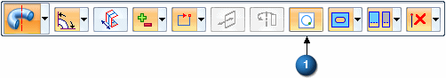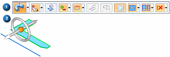 此时命令条更新以显示用于构造旋转特征 (1) 的选项,同时显示旋转手柄 (2)。