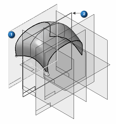 在下面的示例中,选择了“平行平面”选项。选择了参考平面 (1) 作为要与之平行的平面。可以将参考平面 (2) 动态拖动到要插入草图的位置。此外,还可以键入距离。单击要插入草图 (3) 的位置。