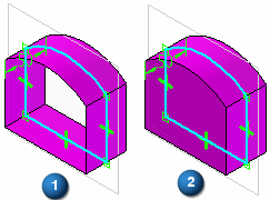 在使用封闭轮廓创建拉伸曲面时,可使用命令条上的开放端部和封闭端部选项来指定曲面的末端是开放的 (1) 还是封闭的 (2)。如果设置了封闭端部选项,将向特征末端添加平面,创建闭合体积。