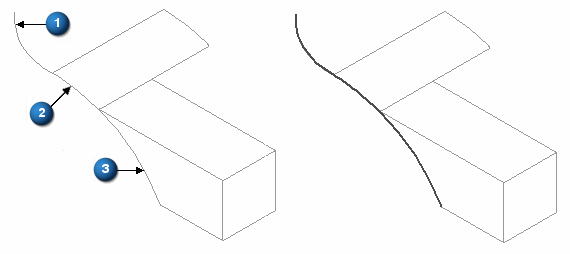 可从多个体构建单条派生曲线。例如,可从草图 (1)、构造曲面上的边 (2) 以及实体上的边 (3) 来构造一条派生曲线。