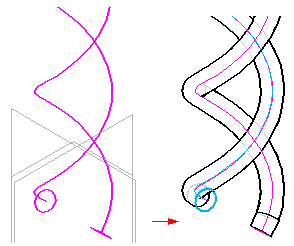 按表创建曲线 命令 使用 Excel 电子表格定义构造曲线。此电子表格嵌入到 创物3D 文档中,使您可以更好地导入及管理设计的曲线。您可以通过创建新电子表格或打开现有的电子表格来生成曲线。例如,您可以通过使用按表创建曲线命令用电子表格创建两条螺旋曲线。您便可以将这些曲线用作构造扫掠拉伸的路径。