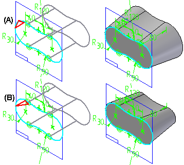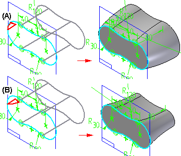可使用对话框中的“翻转方向”和“翻转曲率”选项调整曲率方向和侧面以得到所需的结果。特征旁边将显示图形图像 (A) 以帮助您决定冠状面的应用方式。单击“翻转曲率”和“翻转方向”按钮后,图形图像将会更新 (B)。