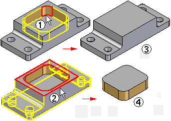 随后选择一个位于所定义区域内部 (1) 或外部 (2) 的面。在您选择的那一侧的其余面会自动高亮显示。您选择的面可控制零件的哪个区域((3) 或 (4))将被删除。