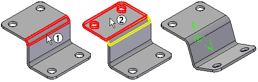 可修改钣金件的折弯角。编辑折弯角时,首先选择要编辑的折弯 (1),然后选择要保持固定的平面 (2)。此操作确定哪些面保持固定,哪些面移动。