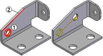“在平面内”选项允许参照平的面 (2) 将一个或多个面 (1) 移动到新位置。在想要重新定位钣金件上的孔或其他特征时,这非常有用。“在平面内”选项要求使用关键点来定义终点。