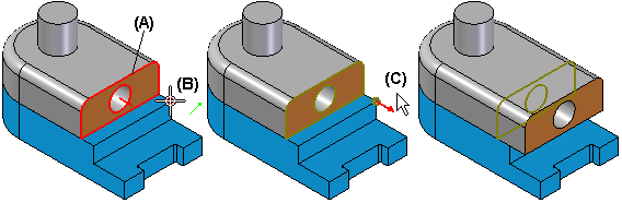 例如,在装配环境中工作时,可能要相对所选关键点 (B) 将某个面 (A) 偏置 10 毫米。定义相对偏置距离时,还必须定义对应关键点的相对方向 (C)。