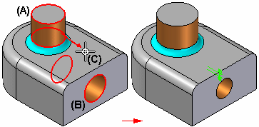 偏置多个面时会导致模型上的某些特征变大,而某些特征变小。例如,选择两个圆柱面(一个属于拉伸 (A),一个属于除料 (B)),然后定义自第一个面 (C) 指向外部的偏置方向,则拉伸面的直径会变大,而除料面的直径会变小。