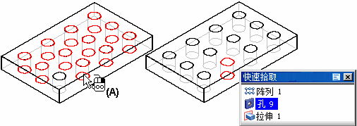 在构造智能阵列时,也可以删除阵列事例。将光标定位在要删除的阵列事例 (A) 上,并停留在那里。当显示省略号时,单击鼠标左键以显示“快速选取”工具。然后,可以使用快速选取功能选择阵列事例,再按 Delete 键删除它。