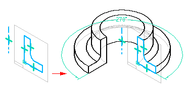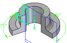 可以定义一个旋转拉伸特征的非对称范围。例如,您可以为方向 1 指定 180 度,为方向 2 指定 75 度。
