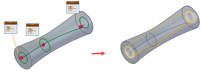 定义路径以沿其扫掠横截面以构造特征。最多可以定义三条路径曲线。定义多条路径曲线时,必须在选定首条路径曲线的元素后单击接受按钮。然后选择下一条路径曲线的元素并再次单击接受按钮。
