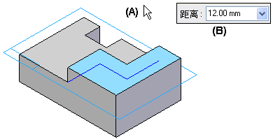 范围步骤 - 定义要添料的范围,方法是使用光标 (A) 或者在命令条 (B) 中键入值。还可以使用另一个特征上的关键点或装配中的另一个零件来定义特征的范围。有关更多信息,请参阅“使用关键点定义范围”部分。在装配环境中工作时,许多特征还允许您选择装配的另一个零件中的关键点,以便按关联方式定义特征延伸量。 |