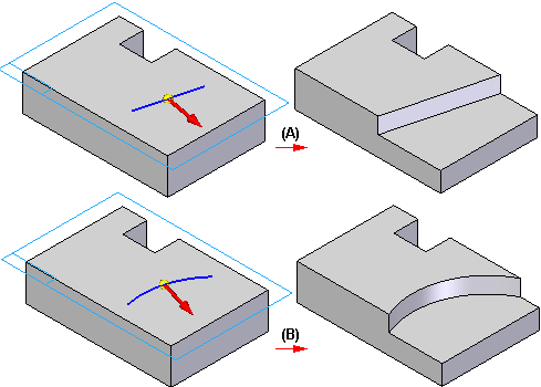 当您使用末端开放的轮廓构造特征时,轮廓两端向与现有模型的相交处延伸。直线以线性方式延伸 (A);圆弧沿圆周延伸 (B)。材料在选择的方向上沿着整个延伸轮廓被添加或移除。