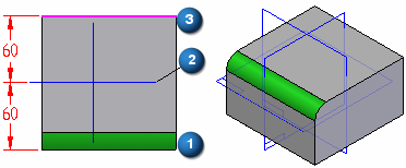 可对处理特征本身或与基于草图的特征一起进行阵列化。例如,可相对参考平面 (2) 镜像倒圆特征 (1),以便为边 (3) 添加倒圆。此选项成功的原因是父边相对参考平面对称。