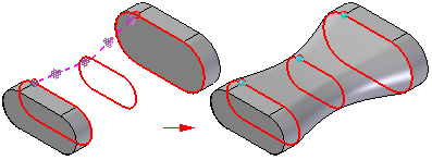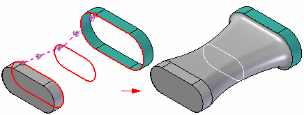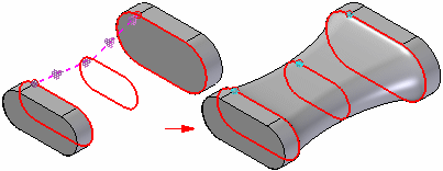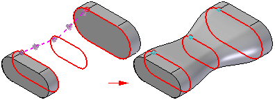 相切连续 - 使用零件边和构造曲线定义的末端横截面支持相切条件。放样体的相切矢量由相邻曲面确定。一个变量被添加到变量表中,可编辑该变量表以控制放样特征的形状。对于使用蓝面命令构造的放样体,您也可以使用图形手柄来控制曲面形状。