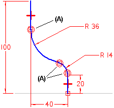 在使用多条路径或多个横截面时,每条路径曲线必须是相切元素或边的连续集合。例如,如果使用轮廓或草图定义路径曲线,则元素必须在它们的连接点 (A) 处相切。
