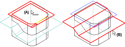 要使用分型几何体构造拔模特征,请先选择平面或参考平面 (A) 来定义参考拔模平面。然后选择所需分型几何体 (B) 来作为枢轴位置使用。在此示例中,使用构造曲面定义了一个分型面。
