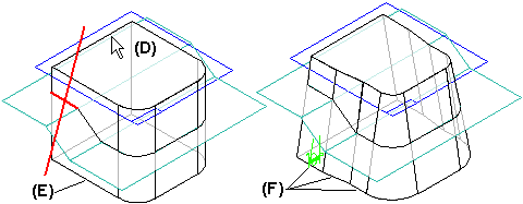 选择要拔模的面并定义拔模角度后,单击“下一步”按钮以继续“拔模方向”步骤。与简单拔模一样,定位光标以定义拔模方向 (D),并在显示正确方向时单击鼠标。根据使用的分型几何体的类型,可能需要将模型上的现有面分割为多块面才能构造特征。在此示例中,将模型一侧上的单个平面 (E) 分割为三个面 (F)。