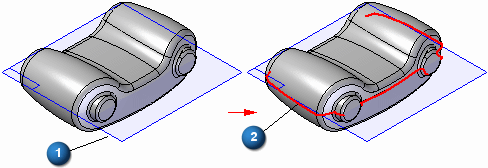 使用分型分割命令 沿零件的轮廓边分割一组面,这在处理要建模或铸造的零件时十分有用。分型线与给定面的轮廓线相同。通过定义参考平面 (1) 可定义用于计算分型线的矢量方向。分型分割特征 (2) 由曲线表示。