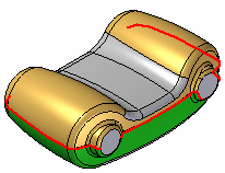 为更好地展示结果,由分型分割特征分割的曲面以绿色和金色显示,如下所示。不分割呈灰色显示的曲面。不穿过此分型线和平面的曲面不由此命令来分割。