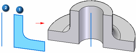 通过围绕用户定义的轴 (2) 旋转草图元素 (1),使用“旋转”命令 对零件添加或移除材料。