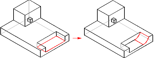 借助复杂倒圆,您可以创建半径小于等于槽深度的倒圆。但是,当半径变得大于槽深度时,倒圆将会失败。