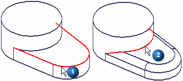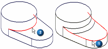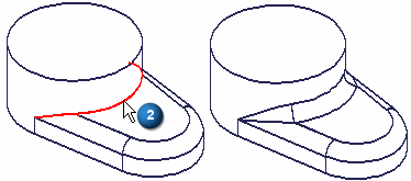 如果颠倒了这两个倒圆特征的次序,并选择边 (2) 作为第一个倒圆特征,则应用此倒圆时边 (1) 的末端就会被修改。
