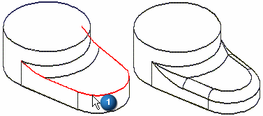例如,如果选择边 (1) 来构造一个倒圆特征,则应用第一个倒圆时,边 (2) 的末端就会被修改。