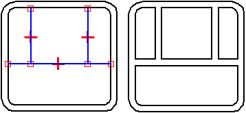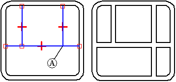 当使用延伸轮廓选项构造复杂的网格筋时,轮廓元素顶点上的连接关系会影响结果。例如,未在竖直轮廓线 (A) 和横线之间应用连接关系时,会将相应的腹板延伸到零件的边。