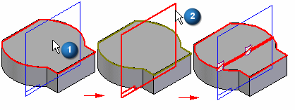 可利用您定义的一个元素 (2) 分割一个或更多曲面 (1)。可以选择曲线、边、曲面、参考平面和设计主体作为分割面的元素。