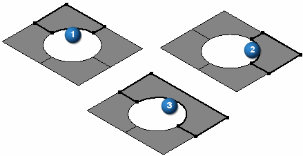 下图显示了曲面 (1) 和曲面 (2) 的可缝合边。曲面 (1) 和 (2) 缝合在一起生成曲面 (3),并显示可缝合边。