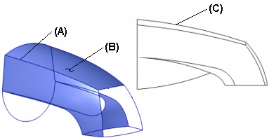 使用曲面建模方法,借助特征曲线,您将会获得更多的控制。特征曲线可以为硬边线或软边线。硬边线是实际模型边 (A),而软边线是理论上的、与视图相关的边线,例如从一边 (C) 查看曲面 (B) 时。软边线也称为轮廓边。在定义曲面的流线、美学特征和整个形状时,两种类型的边都很重要。