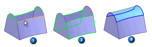 通过您所定义的边界元素来创建构造曲面。边界元素可以是曲线或边,且必须定义一个闭合区域 (1)。也可指定是否使用任意相邻面 (2) 控制新有界曲面 (3) 的相切。