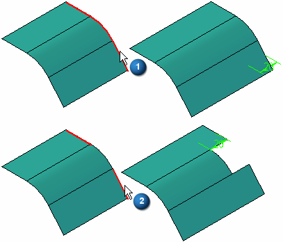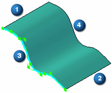 当延伸非解析曲面时,可以将延伸指定为“线性”延伸、“曲率连续”延伸或是沿某些类型的边“反射”延伸。例如,当延伸用 B 样条曲线构造的拉伸曲面时,可以为与输入 B 样条曲线 (1, 2) 平行的两个边指定“线性延伸”、“曲率连续延伸”或“反射延伸”选项。