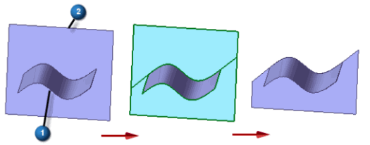 注释:曲面 1 用于修剪曲面 2。因为曲面 1 没有延伸至曲面 2 的边,所以在修剪边界元素上将添加线性延伸部分。选作修剪工具的输入元素(曲面 1)不会被修改。