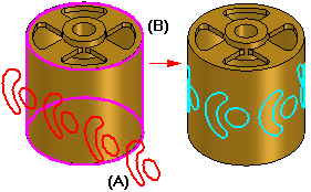 可以将草图元素 (A) 缠绕在一个或多个曲面 (B) 周围。可以选择单个草图元素,一系列草图元素或整个草图。缠绕的元素与原始草图元素关联。