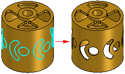 将草图元素缠绕到可展开曲面(如圆柱或圆锥)上时,相对于原始草图元素来说,稍微有点变形或没有变形。将草图元素缠绕到双重弯曲的曲面(如圆环面)时,会有些许变形。