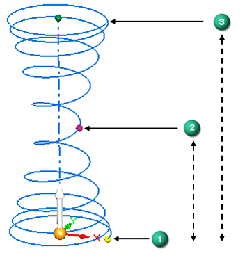 选择此选项可创建在整个轴长度内支持螺距和直径变化的螺旋曲线。定义这种类型的螺旋曲线时,使用的点可以在长度方面恒定或变化,并支持多次螺距和直径变化。