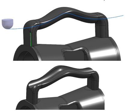 在下面的示例中,工具遵循 3D 路径。轴锁定方向由手柄竖直面的边表示。