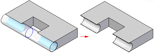 选择时,此选项允许您设置结果颜色以及工具体颜色。结果颜色是指生成的特征的颜色。工具体是指除料与模型几何体未相交时除料的颜色。在以下示例中,请注意:范围与模型相交的区域是默认的工具体颜色。一旦范围与模型相交,那么与模型相交部分将更改成默认的结果颜色。