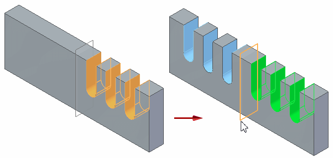 在同步建模环境中,可以沿着面移动槽,编辑槽特征以更改槽宽度或范围等信息,也可以编辑槽轮廓以更改用于创建槽的草图元素。有关更多信息,请参见在同步环境中移动或编辑槽。