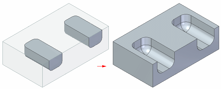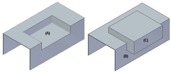 可在选定体 (B) 上创建压花特征 (A),将另一个选定体 (C) 用作压花工具。