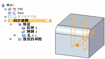 在同步建模环境中构造一个或多个孔时,可以将孔动态拖动到模型中的任何面上。