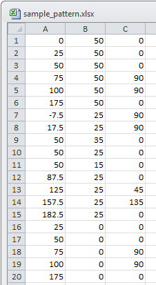Excel 电子表格包含每个阵列实例的 XY 位置和旋转角。列 A 包含距选定参考点的 X 距离。列 B 包含距选定参考点的 Y 距离。列 C 包含阵列实例的旋转角度。每行是一个阵列实例定义。