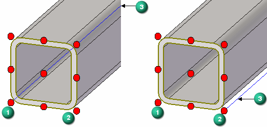 显示横截面范围框点(红色圆点)。 选择九个默认捕捉点之一时,横截面将偏移,以使所选捕捉点连接到路径 (3)。 默认捕捉点 (1) 位于左图中的路径 (3) 上。如果选择操纵点 (2),那么该点将移动到路径 (3),如右图显示。 |