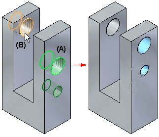 在使用“相关”命令对齐元素时,种子元素 (A) 将以与选择集中剩余元素不同的颜色显示。种子元素将用于确定关系应用方式的基础。例如,对选择集中的两个圆柱元素应用同心关系时,种子元素 (A) 将与目标元素 (B) 同心对齐。