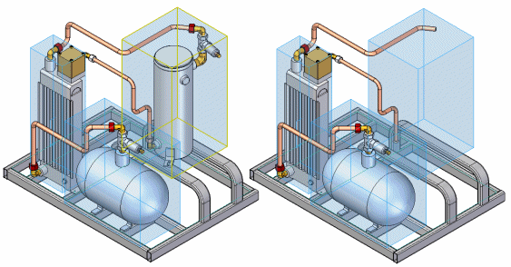例如,可以在“选择工具”选项卡上选择一个区域条目,然后单击快捷菜单上的“隐藏”命令以隐藏该区域内的所有装配部件。