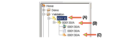 每个对象必须有一个唯一的标识符 (ID)。对于零组件,此标识符称为“零组件 ID”。在以下示例中,零组件 (A) 的零组件 ID 为 000130。该零组件的零组件版本 (B) 是 A,这样就添加了一个唯一的“版本”名称,后面是数据集 (C) 及其零组件名称。