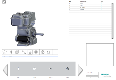 文档发布后,轮播视图会显示每个 PMI 模型视图的缩略图预览,其下方带有模型显示配置、关联尺寸和注释以及用户定义模型视图名称。