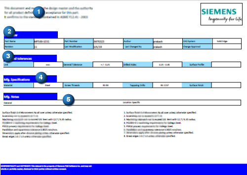 审核已发布输出的内容时,第一页通常包含通过属性文本派生的项目、模型和文档信息,包括零件名称、文件名、版本、日期、审核者、尺寸公差和制造规范及注释。以下示例显示了通过属性文本值填充的五个不同区域。