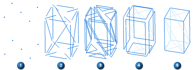 多边形网格体是 (1) 顶点、(2) 边 和 (3) 面的集合,它们定义 3D 空间()中 (4) 多面体对象的形状,其中一个或多个共面的面形成 (5) 曲面。在 创物3D 中,面由三角小平面组成。因此,这种类型的体通常被称为小平面体。多边形网格显式表示体的曲面,而空间体是隐式的。